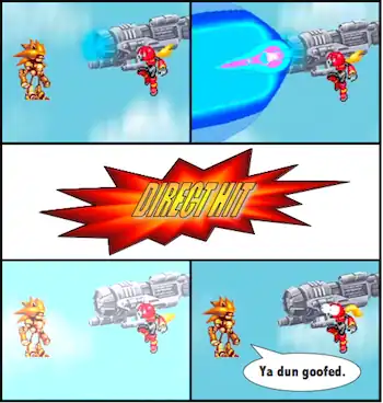 - As a tribute to Dragonball Z, Super Mario Bros Z hasn't shied away from this trope. The Bowser battle featured a full-on Kamehame Hadoken-worthy Fireball attack from Mario that didn't even make a scratch on Metal Bowser. And during the early stages of the Mecha Sonic battle on Yoshi's Island, Axem Red decides to try out his "secret weapon," a BFG that unleashes a Wave Motion Gun-worthy blast that turns out not to have worked on him, just before the Big Bad lays into him with an Akuma-style Raging Demon and a Kamehame Hadoken of his own to finish him.