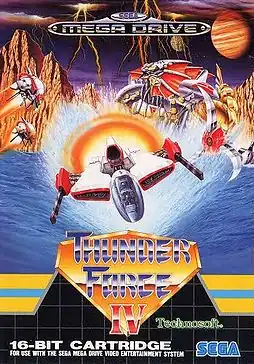 - Thunder Force IV (Genesis/MD, 1992) -- Released as Lightening (sic) Force: Quest for the Darkstar in North America. Ported to the Saturn via Gold Pack 2, with less slowdown and Thunder Force III's player ship as an unlockable ship.
