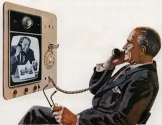 Like Flying Cars, Ray Guns, and, of course, Jet Packs, this is one of the most frequently observed tropes in depictions of The Future and originally popularized in the Raygun Gothic era of Science Fiction, but where most of these ubiquitous genre tropes remain absent from our reality, the Video Phone has been publicly available in one form or another since 1936; the German government ran public videophone booths prior to WWII, though these early trial services were disrupted by the war. AT&T opened the first public videophone booth in the US in 1964.