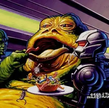 - Jabba the Hutt, baby! And yes, the Hutts are all fat, but the Hutts are also all evil with only a handful of exceptions - and those tend to be a little more mobile. The bigger they get, the more arrogant they are. Jabba in particular can and will eat people alive, and is the Trope Namer for Jabba Table Manners.