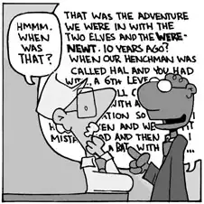 - In the first strip of DM of the Rings, the characters talk amongst themselves and their speech bubbles partially hide the DM's captions, who is rattling off the campaign's endless backstory in the background.