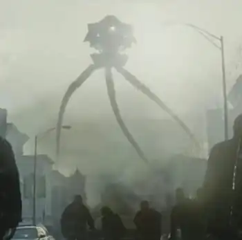- Does This Remind You of Anything?: The alien invasion has many deliberate similarities to 9/11. The shot of the vaporized victims' clothes floating down recalls the paper falling from the sky after the towers went down, the shot of Ray covered head to toe in grey ash after escaping the first tripod, and there's a pretty deliberate shot of a wall covered by pictures of missing people. When she sees the heat ray, Rachel even asks "Is it the terrorists?"