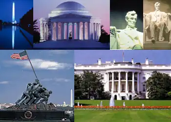 - ↑ Clockwise: The Washington Monument, Jefferson Memorial, a statue of Abraham Lincoln found in the Lincoln Memorial, the White House and a memorial at the National Cemetery.