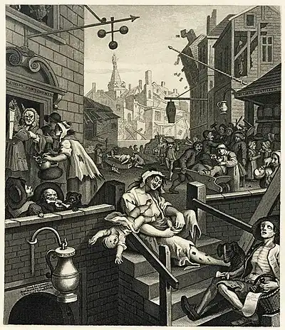 - The picture for this trope is inspired by the city of Bath in the south of England, which in the Georgian period was an aristocrats seasonal playground. Whilst the city was good if you were rich, the poor lived in... well look at the picture. The picture is entitled Gin Lane and was drawn as contrast to Beer Street, showing pleasantly mellow people chatting and discussing politics, to comment on the problem of cheap Gin in England at the time. Gin was seen as being as corrupting as crack today. Considering just how cheap it was and how prevalent abuse could get, it wasn't an exaggeration.
