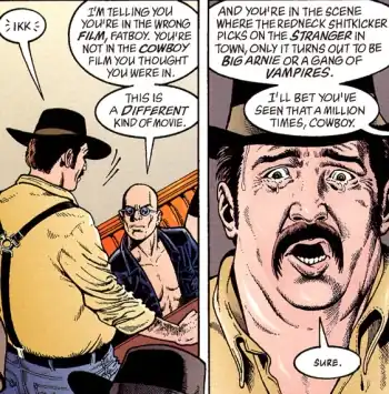 If a character in a series that has a Fourth Wall thinks mainly in terms of tropes, you've probably got a character who's Wrong Genre Savvy. Even if you're correct about being in a story, it's possible for you to guess wrong about your role in the story, the genre of the story, or where on the various sliding scales your story is. Any way you spin it, it's still a common way of subverting Genre Savviness.