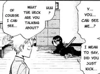 - Rukia's reaction when Ichigo addresses her in the first chapter of the manga. Ichigo takes this a step further, and kicks her when she apparently tries to break into his home.