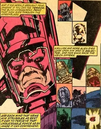 - In one instance when Galactus appears before a large number of species, the page is filled with numerous smaller pictures showing how each species perceives him.