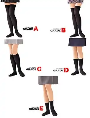Some costume and cosplay enthusiasts categorize zettai ryouiki into five "Grades", from E to A. Only the top two (A and B) are considered true Zettai Ryouiki and they are only usable by females. Some researchers additionally introduce Grade S, the highest one which consists of Grade A plus further requirements to personality and hairstyle. Further reading on the grades here on Anime Deshou Deshou.