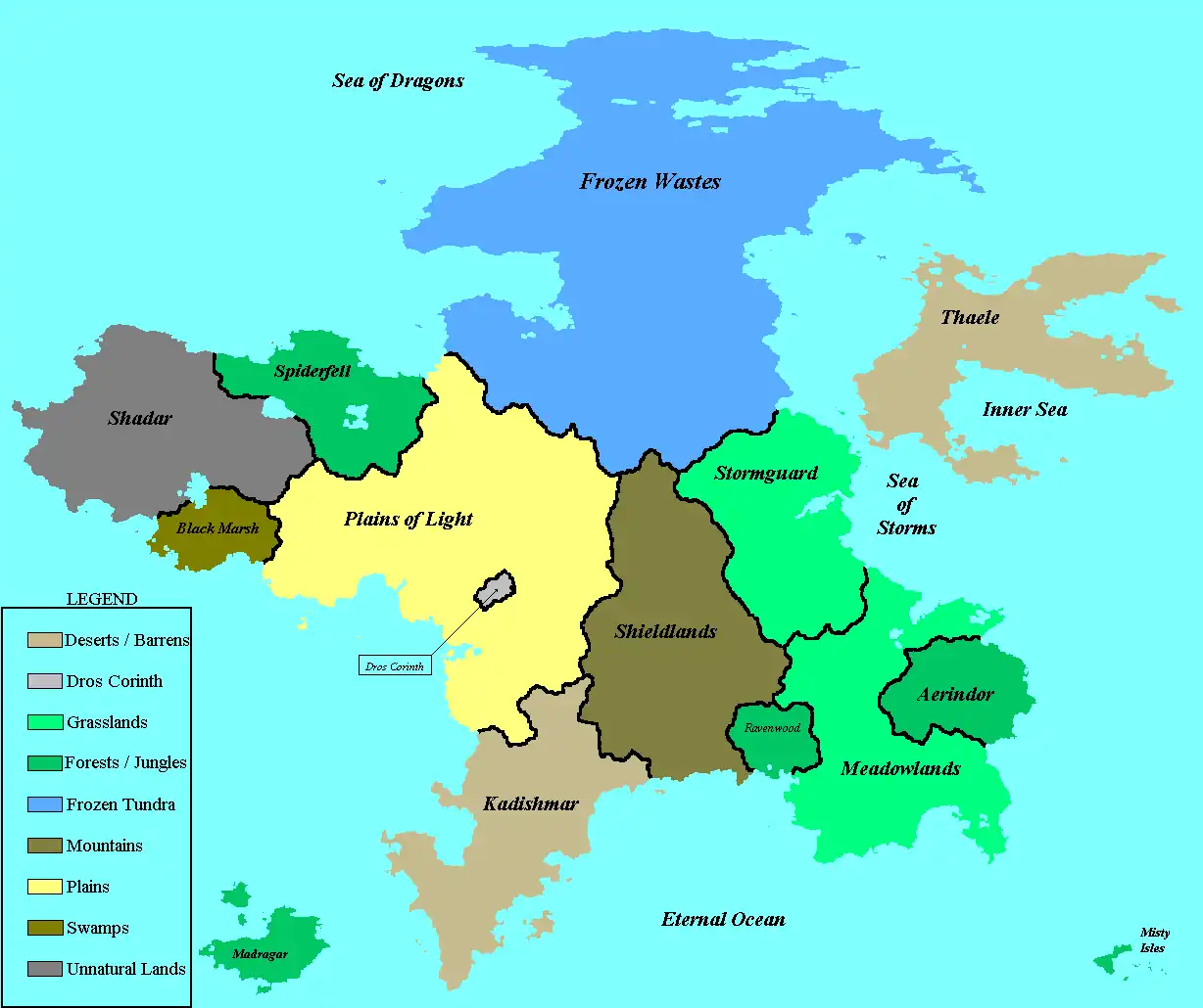 Aerinthia is a diverse realm divided into the kingdoms of Aerindor, Kadishmar, Meadowlands, Stormguard, Shadar, and the Shieldlands. Aerinthia’s diversity is not only encompassed in its kingdoms, but also in its landscape. Dense forests, rugged mountains, barren deserts, fertile grasslands, and the dark foreboding wastelands. Between the kingdoms of Shadar and the Shieldlands lays the ruins of a flourishing empire. All that remains of the once proud empire is Dros Corinth, known as the Citadel of Light. The plains are now ruled by a nomadic people. Also spread across Aerinthia is the untamed Ravenwood, Black Marsh, and Spiderfell. These untamed places are gathering places of orcs, goblins, trolls, and other monstrous creatures.