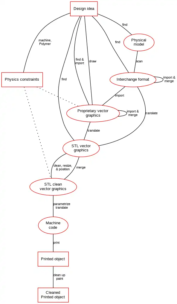 As you can see, there are several paths that lead from a design idea to a printed object. Absolute beginners can start simply by downloading STL files from a repository such as Thingiverse, positioning it, maybe re-sizing and then printing it. Intermediate users can merge existing objects together at any level, e.g. at STL level with a tool like Meshlab (free) or Netfabb (commercial).