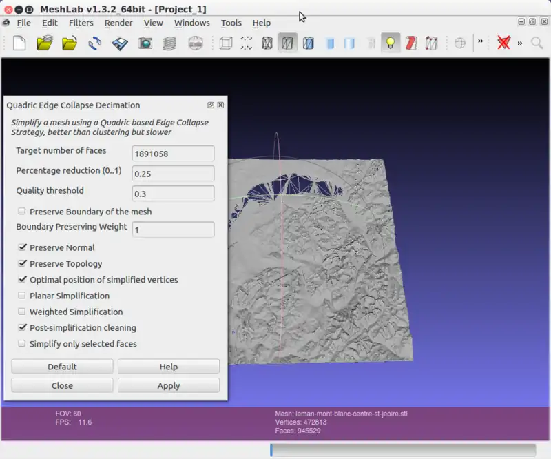 - If the model represents a very small area you can slice it "as is". If it is larger, consider reducing the triangles (if not done before), e.g. using the free Meshlab program to do that (see below)