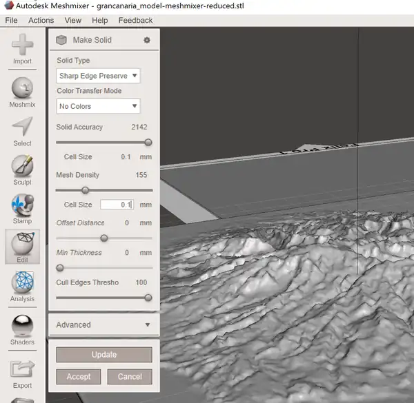 - To be on safe side, we used "Make Solid", using 0.2mm cell size and "sharp edge preserve". This took ages to compute (we aborted a 0.1mm solution). The resulting file grew again to over 200MB.