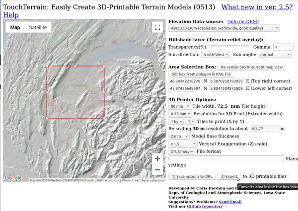 The TouchTerrain software [1], developed by Chris Harding and Franek Hasiuk (Iowa State University), is a very easy to use online service, also available as offline program, to create printable 3D STL models. It grabs DEM data from Earth Engine and turns them into STLs. It has a bunch of settings (simple and “expert”). It also allows printing multiple 3D models that can be glued together into a bigger model.