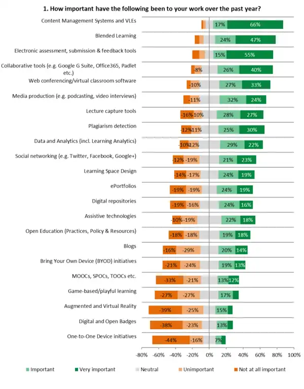 [...] As with previous surveys ‘Content Management Systems and VLEs’ remains the top area of importance within current and future practice. ‘Blended Learning’ has overtaken ‘Electronic assessment’ in terms of ranked importance for current practice, but ‘Electronic assessment’ remains ranked second for future practice. ‘Lecture capture tools’ saw the greatest jump in importance in current practice, moving from 14th to 6th. ‘Assistive technologies’ continues to see strong increases in the importance for current practice.