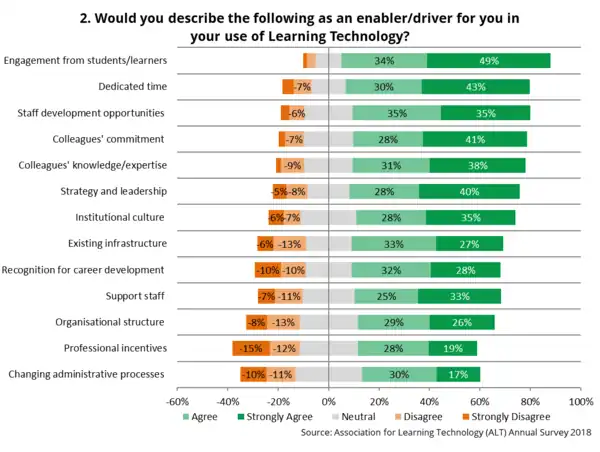 As with all previous ALT Annual Surveys the top enabler/driver for the use of learning technology is examined. In this area ‘Engagement from students/learners’ remains the top driver but this year saw ‘Dedicated time’ having the biggest change jumping from ranked 5th to 2nd. Taking in to account the survey results since 2014 the areas that have seen the biggest increases are ‘Professional incentives’, ‘Staff development opportunities’ and ‘Recognition for career development’.