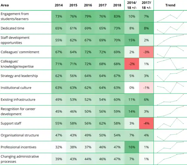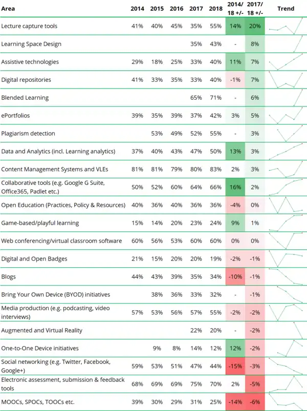 - ↑ Hawksey, Martin (2019) Association for Learning Technology Annual Survey 2018 Data and Report. [Dataset] http://repository.alt.ac.uk/2431/