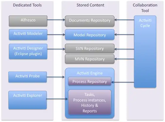 The following figure explains how different Activiti components (a popular BPMN suite) combine to form a complete solution for BPM in the full context of software development. The blue components are part of the Activiti scope. The gray components are out of scope. (Activiti Components, retrieved 14:30, 19 December 2012 (CET))