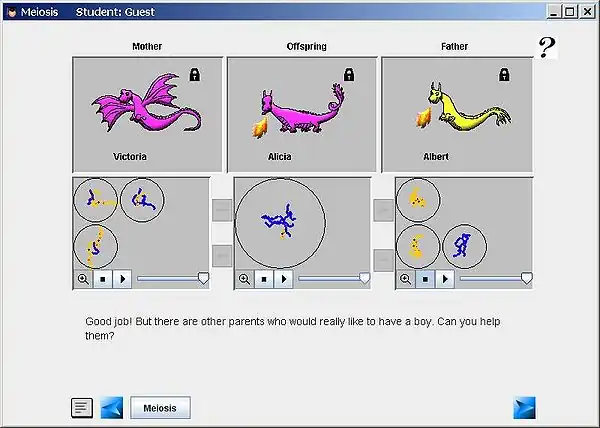 Of course, I didn't learn much. This is a typical simulation without teacher and teaching scenario effect. Maybe you are not totally happy with Alicia. I think she should have wings. By clicking on the + icon you could see chromosomes details .... an make a baby with wings ;)