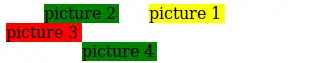 Below is screenshot of a complete example using id identifiers for the divs that we position. As you can see the first (yellow) div is not shown first. I will move 4cm to the right (i.e. left is 4cm). The second one (green picture 2) normally should then be positioned on top left, but it's moved 1cm to the right. The third one (red) will be to the left on line two, i.e. the line that follows the one taken by the first green one. The final one (green also), stays also on its line, but moves about 2cm to the right.