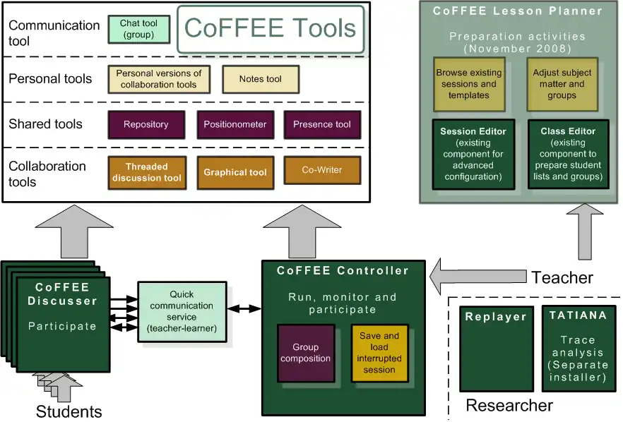 “CoFFEE is a suite of applications to support collaborative problem-solving discussions in the classroom. Its main components are a series of tools for collaboration, shared work, individual work and communication. Around these core tools, several other components make it possible to plan, run or participate in a CoFFEE lesson (or session).” (Coffee-soft.org, retrieved 11:22, 12 January 2009 (UTC).)