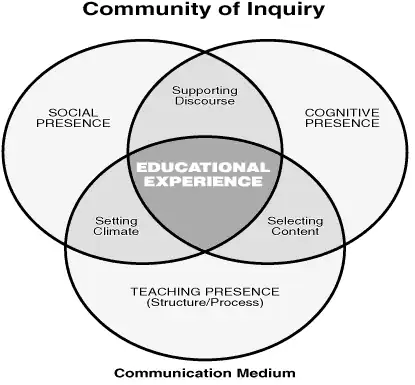 Garrison, Anderson & Archer (2001) includes a table that illustrates “the relationship among the three essential elements in a community of inquiry, as well as the indicators of those elements that occur in a computer conference or other venue for a true community of inquiry, and the categories into which we have grouped the indicators.”
