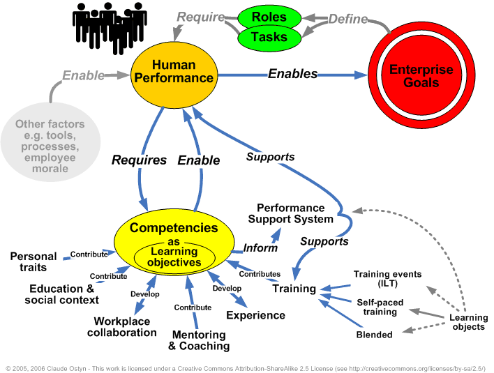The following figure by Claude Ostyn, shows a model of the Ecosystem of competence management. “This diagram is an attempt to show how learning management, training management and performance support systems can be aligned with business goals as part of an "ecosystem of competencies".” (2005)