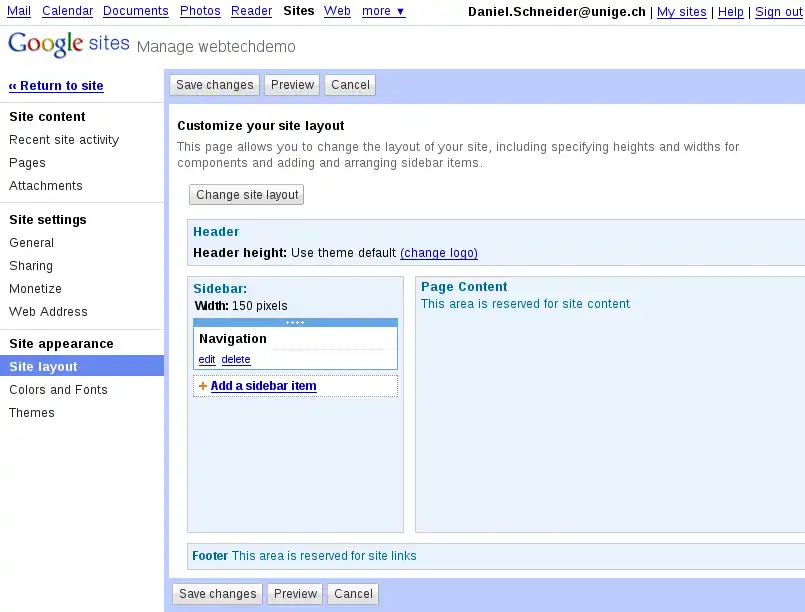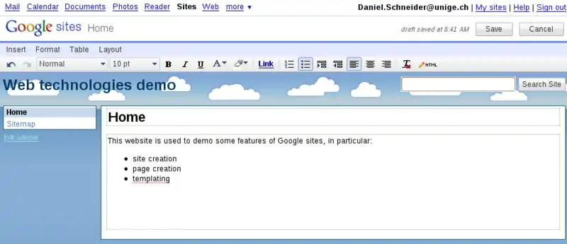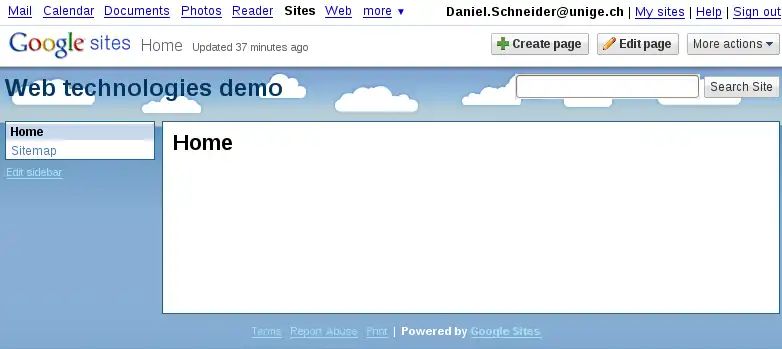 “Google Sites is an online application that makes creating a team web site as easy as editing a document. With Google Sites, people can quickly gather a variety of information in one place -- including videos, calendars, presentations, attachments, and text -- and easily share it for viewing or editing with a small group, their entire organization, or the world.” (What is Google Sites?, retrieved 19:25, 13 August 2009 (UTC)).