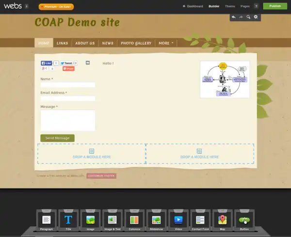 - Various web site creating services like Webs. These offer a free version with advertisement and various (fairly cheap) commercial versions.