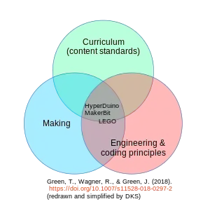 Digital design and fabrication for ICT education most often means assembling a robot from a variety of technologies and the programming it. Some technology, e.g. HyperDuino, Makerbit or LEGO Mindstormsare more suitable to combine making and programming while respecting the curriculum, according to Green at al. who created a little taxonomy that allows classifying use of tools according to educational outcomes. “The curriculum domain focuses on outcomes that support learners using the tools to understand and demonstrate understanding of content (particularly related to content standardsThe making domain is strongly focused on outcomes that are craft-centric (i.e., making a product). The principles of engineering and coding domain focuses on outcomes associated with coding as the curriculum; learning to use the tools is the primary outcome of this domain. The overlapping of the circles combines the outcomes of the different domains.” (Green et al. 2018)