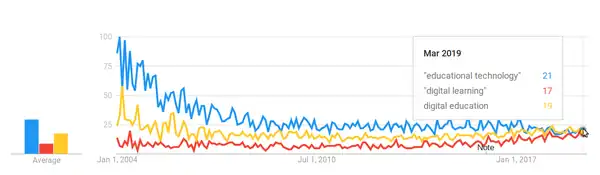 World-wide, since 2004, digital learning and digital education are on a raise with respect to "educational technology". There also exist regional differences. Digital education also could refer to IT education.