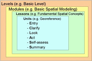 “Within each unit a similar structure as on lesson level is employed. However, the elements glossary, bibliography and metadata are always defined for the whole lesson on lesson level. The actual content within a unit is stored in a number of so-called "learning objects" (not to be confused with the learning objectives - called "goals" within eLML). Each learning object describes a certain concept, model, equation, term, or process using all or some of the three elements clarify (theory), look (example) and act in free order. These three elements can have a special visual representation when transformed into a presentation format - e.g. a "gear" icon for act elements as used in GITTA to signalize the student that he or she has to "do" something - but their main purpose is to guide authors while creating content. Using the elements clarify, look and act, the author has to think about how a certain concept can be presented best to the student. Whether a learning object starts with some theory (clarify element) and continues with one or more examples (look elements) or, alternatively, the student first has to do something (act element) and then reads the theory afterwards (clarify element) is left to the author.” ([3], retrieved 19:05, 30 May 2007 (MEST))