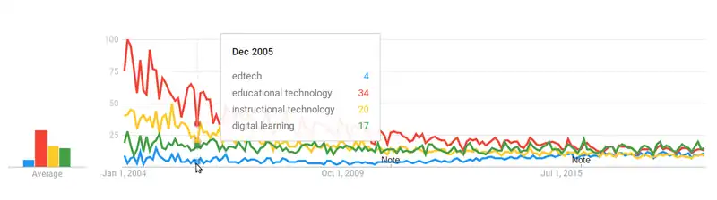 The following graphic shows the evolution according to google trends. Globally speaking, interest in the field has much declined. This can be explained by the fact that search terms like "educational technology" have been replaced by trendy technology, such as "MOOC" or "e-learning", not shown in the figure, as explained in the digital learning article.