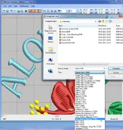 Typical embroidery software allows to create embroidery design files that define parametrized embroidery objects such as lines, sating columns or fill areas. These objects can be created directly through technical drawing or be translated (digitized) from vector drawings. From embroidery objects one can generated stitches that then can be exported to proprietary machine (stitch) formats that can uploaded to an embroidery machine.