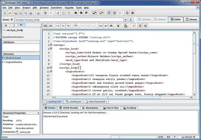 Very important: Exchanger has a little bug that requires you to define a well-formed XML file with a correct header and an inserted root element before you start editing. This is a quite "normal requirement". But, then you must close this *.xml file and re-open it again in order to make the editor DTD aware. In other words, if you don't create this skeleton, then close and open it again, the editor will not help you with XML editing as described below.