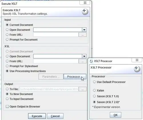 In addition (truly important !), it seems that only the Saxon 2.0 processor is working in the V3.3.1 edition. Therefore you must define the right processor. You can do this by clicking on the Processor button as shown in the figure below, but we rather suggest to change the global preferences in Menu file->Preferences; XML Tab. Saxon 2.0 is probably the best XSLT processor anyhow.