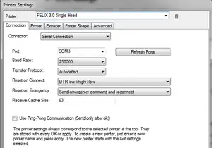 In order to start go to Config-->Printer settings and select your printer type, that is single or dual head and press Refresh Ports. Finally choose the COM-port that belongs to your printer and leave the default commands.