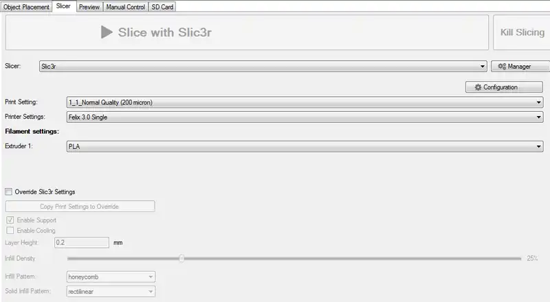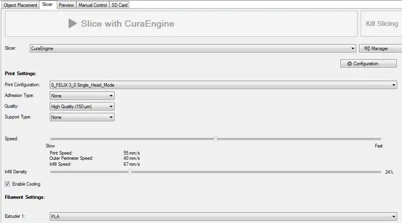 • The open source Repetier-Host program will pilot the printer through a USB host cable. It will interface with three different slicer programs, i.e. skeinforge SFACT (a skeinforge modification) or Slic3r. A distribution with a pre-configured SFACT/skeinforge and slic3r is available from Felix (for registered forum users)