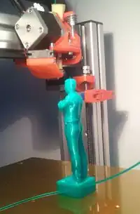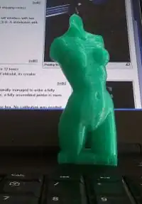 If you use the included SFACT/skeinforge distribution, the default settings are ok for first prints. The print to the right was a small version of Pink Panther Woman by Pedro Januário (thingiverse) on top of a Lego. The bottom of the Lego piece is difficult to print and it came out better than with my other 3D printers. The woman on top is fairly easy to print, but some printers have trouble with the neck and the chest...
