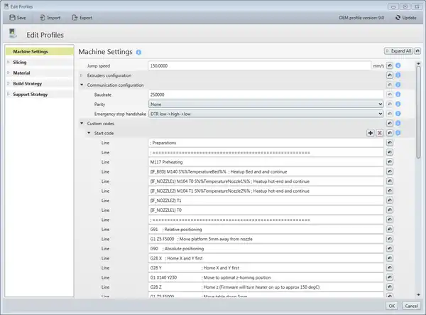 - Start-up code is not "per printer" but per slicing profile, i.e. you could lower the nozzle a bit for prints that have a tricky first layer.