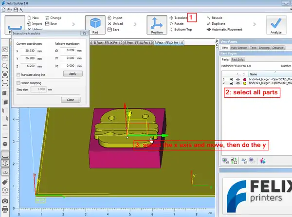 - Z-coordinates when translating should not use the Z-center but the bottom. Otherwise, it's a bit painful to stack objects. Alternatively, the software should allow importing objects with optional x,y and z coordinates. As of now, importing puts the object somewhat in the middle of the platform and all objects are lowered to z of bottom =0