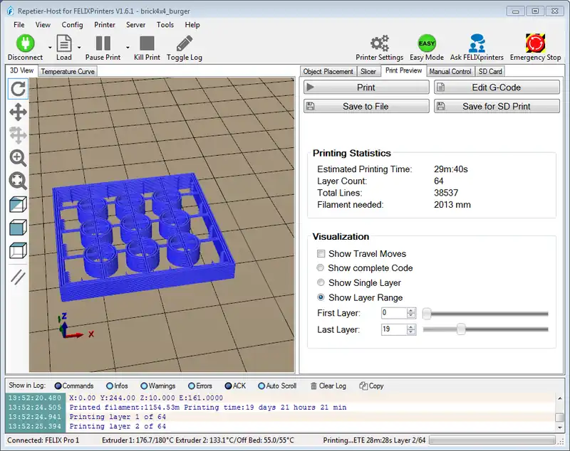 - In principle, one could use any controller/slicer software. As of May 2016 there are profiles for the following slicers: Felixbuilder (commercial, included), Repetierhost (Slic3R and Cura), KiSSlicer (simple and commercial Pro version), Simplify3D (commercial). Felixbuilder and Repetierhost are distributed through Felix. KiSSlicer and Simplify3D profiles are available from Felix.