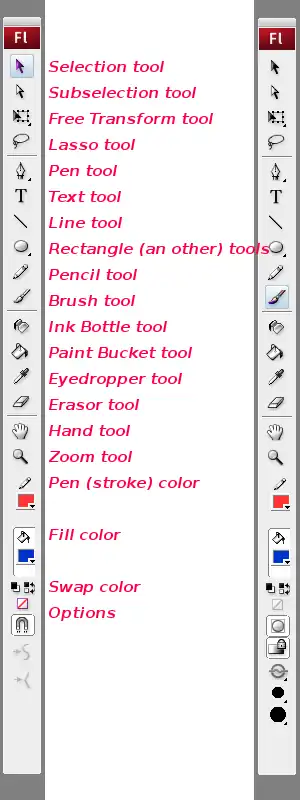 Also see the figure "Items of the Flash CS3 tools panel" above in order to identify the corresponding icons in the tools panel. Some tools are stacked on top of each other. Hold down the mouse button for while to see the hidden ones.