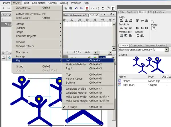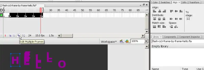 You also may align objects in several frames. For example, to align letters in all frames: Click on the Edit multiple frames button in the bar below the timeline.