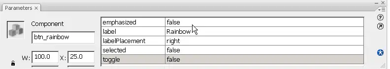 “The Button component is a resizable, rectangular button that a user can press with the mouse or the spacebar to initiate an action in the application. You can add a custom icon to a Button. You can also change the behavior of a Button from push to toggle. A toggle Button stays pressed when clicked and returns to its up state when clicked again” Adobe documentation (see above)