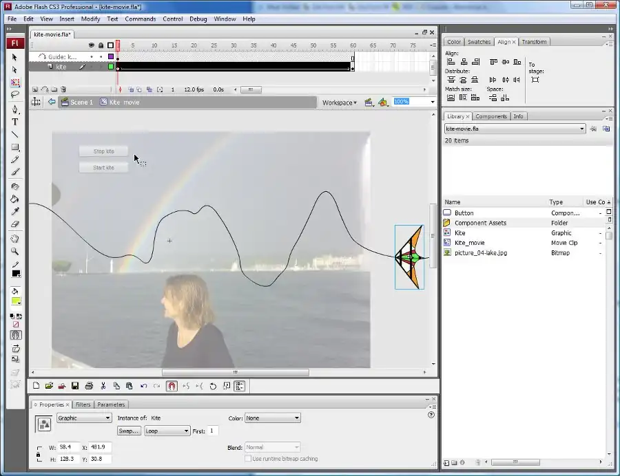 By editing a movie symbol you basically can do the all the stuff you have learnt about creating flash movies in previous tutorials, e.g. in the Flash motion tweening tutorial. In other words, movie clips have their own timeline as you can see in the above picture. There is a motion tween for the "Kite" drawing and a Motion guide layer. The whole thing is called the "Kite_movie" movie clip.