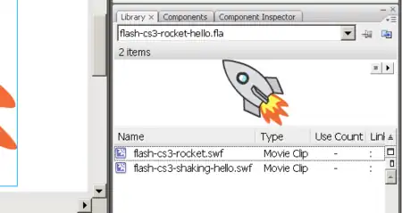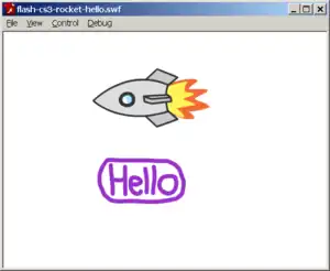 Firstly, have a look at the result, i.e. a flashing hello and little rocket with a pulsating engine. Both were made originally in separate *.fla files and then compiled (saved) to