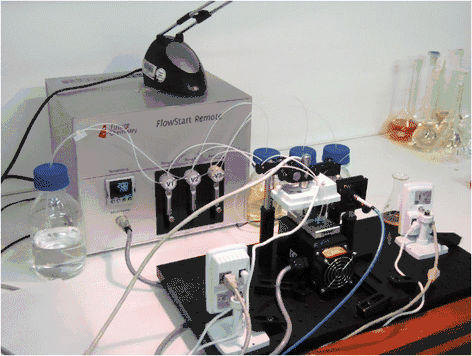 The following picture shows lab equipment that can be remotely controlled and shows the set up for a chemistry experiment on production of methyl orange. [2]