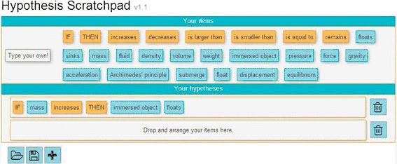 The next image shows Hypothesis scratchpad, a conceptual tool that is available to configure Inquiry-based learning scenarios. It allows students to compose hypotheses by dragging and combining predefined terms or by using self-defined terms or sentences and is based on prior work by van Joolingen and de Jong (1991). [3]