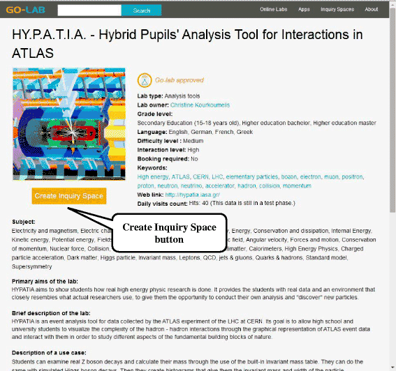According to the about page (May 13, 2019), “The Go-Lab Ecosystem (or the Go-Lab Sharing and Authoring Platform) targets science teachers from primary and secondary schools and aims to help them enrich their teaching practices with innovative teaching approaches and supportive technical tools. The Go-Lab Ecosystem consists of the two main components: The Go-Lab Sharing Platform provides a large collection of quality-proven remote and virtual laboratories (“Labs”), shared by renowned research institutions and technology providers from all over the world. [..] Furthermore, multiple web-applications (“Apps”) are offered, supporting students in their inquiry learning activities and teachers in the preparation, implementation, and monitoring of these activities. Finally, teachers have a possibility to share Inquiry Learning Spaces (“Spaces”) they create for their students with other teachers [..]. The Go-Lab Authoring Platform enables teachers to easily create Inquiry Learning Spaces, which are virtual spaces, structured according to the phases of the inquiry learning process and containing online labs, inquiry learning apps, and any other multimedia learning materials selected by the teacher”