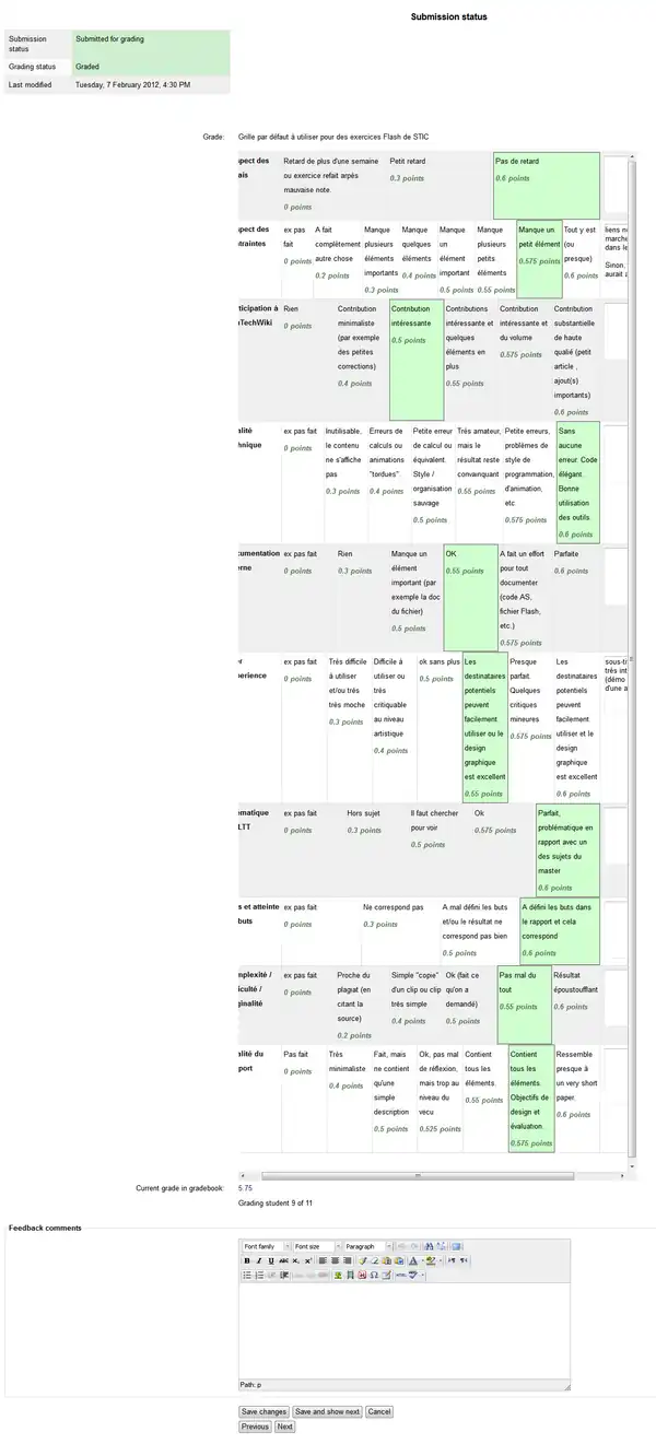Below is a screen shot (in french) that again shows a homework rubric. Each homework is a mini-project that is graded according to 10 critera. Moodle allows to use different performance indicators for each criterion which makes more sense, but may be more difficult to handle for some teachers.